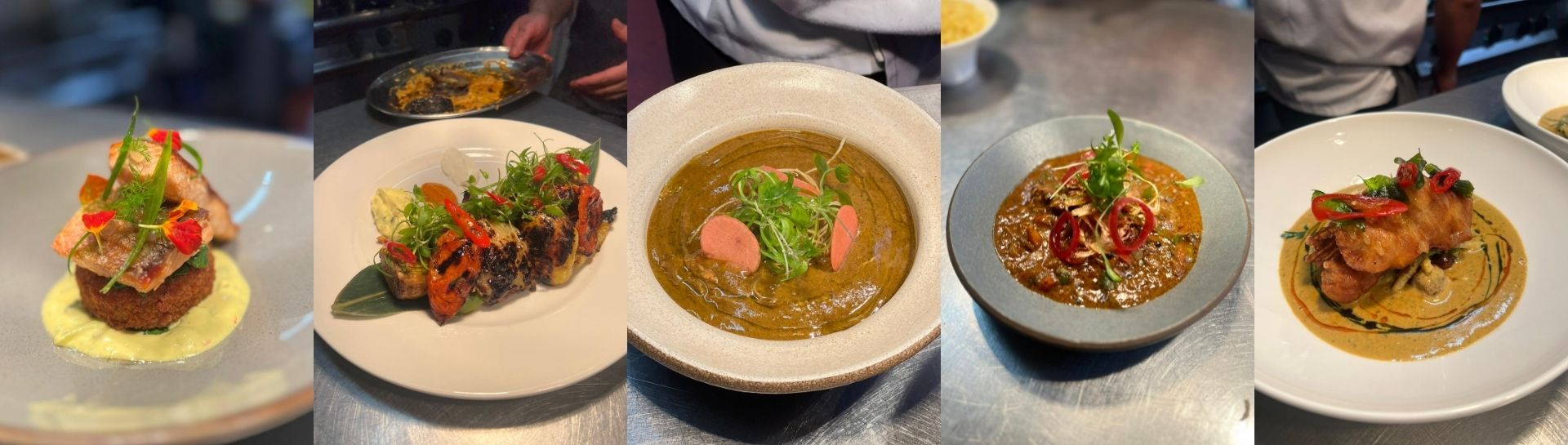 (Braised Pork Belly, Sweet Corn, Saag, Pineapple, Chutney, Vindaldo Saag, served with Pilau Rice)